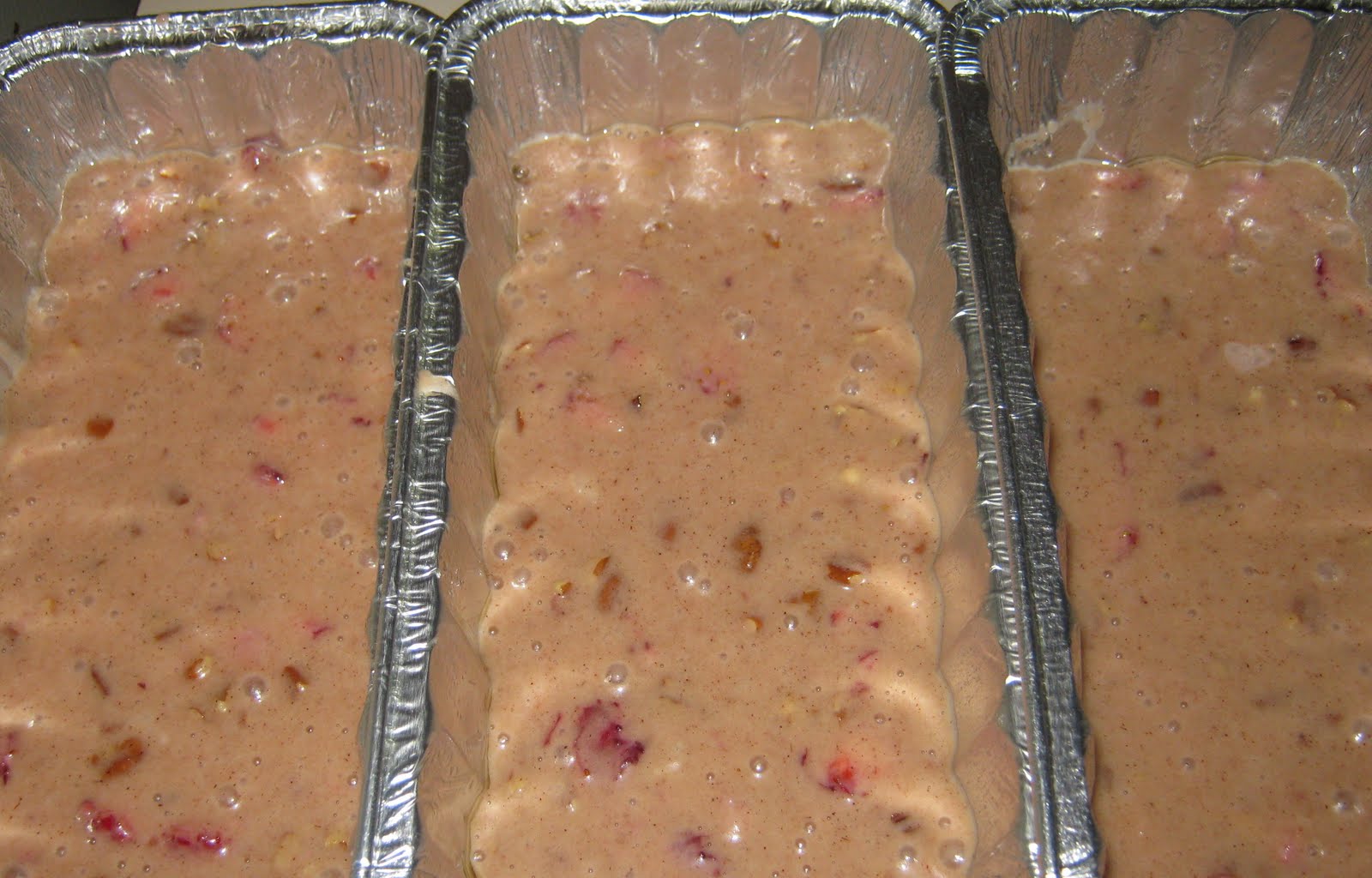 Pour batter into small loaf pans and bake at 350 for 50 minutes