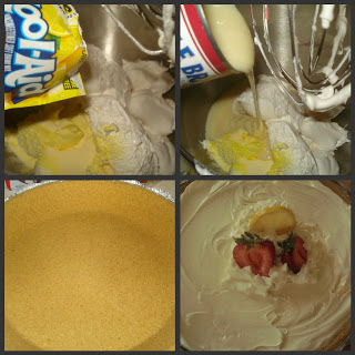 These are the ingredients you will need. Graham Cracker Pie Crust, 8oz Cool Whip, 1 package Kool Aid(your choice.) 1 can Eagle Brand condensed milk. I used a 16 oz container of Cool Whip because I was making two pies. I also used a fresh lemon, Reddi Whip and fresh strawberries for garnish.