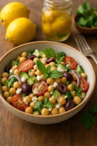 Quick, fresh, and packed with flavor—this no-oven Mediterranean chickpea salad is the perfect late summer dish.